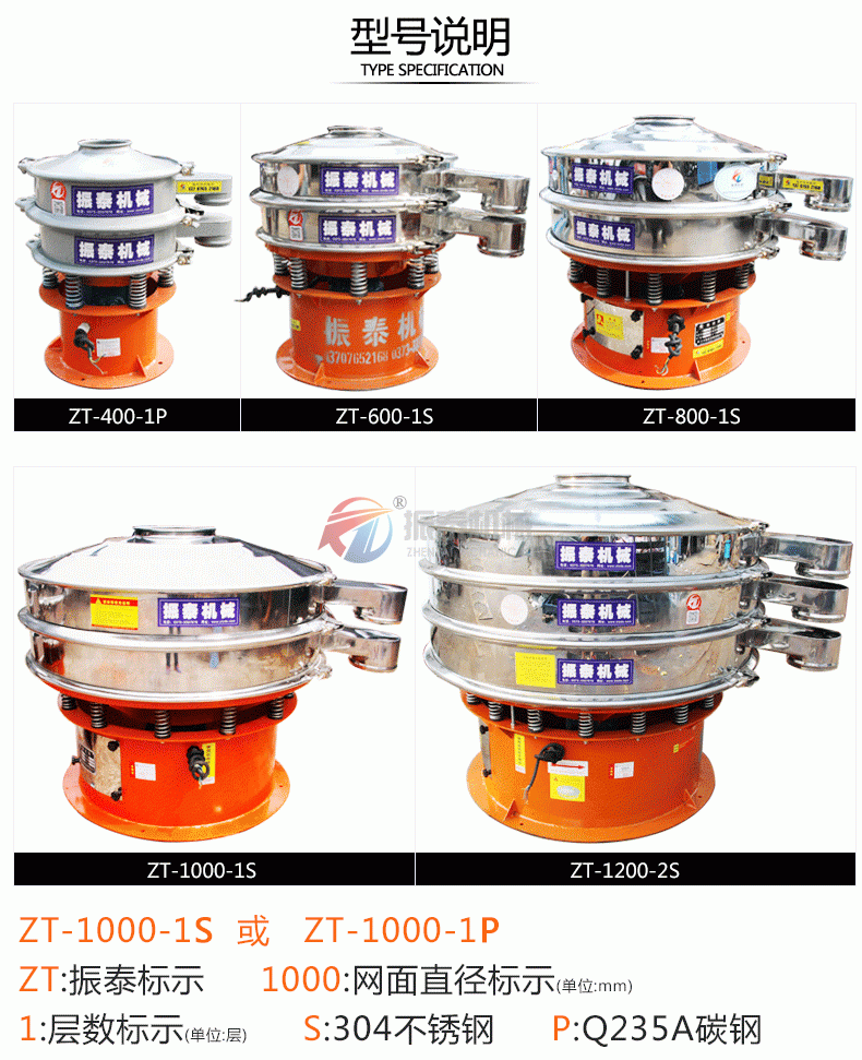 1. 氧化锌振动筛型号可根据产量需求定制,定制范围为直径600-1500,型号越大产量越大;